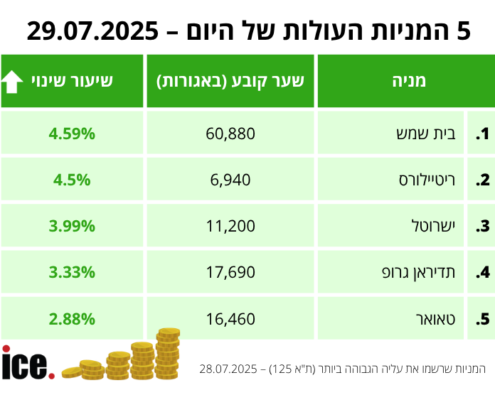 המנייה השלישית היא ישרוטל שעולה ב-3.99% לרמה של 11,200 אגורות. הרביעית היא תדיראן גרופ שעלתה ב-3.33% לרמה של 17,690 אגורות. בסוף הרשימה החיובית נמצאת טאואר, שעלתה ב- 2.88% לרמה של 16,460 אגורות.