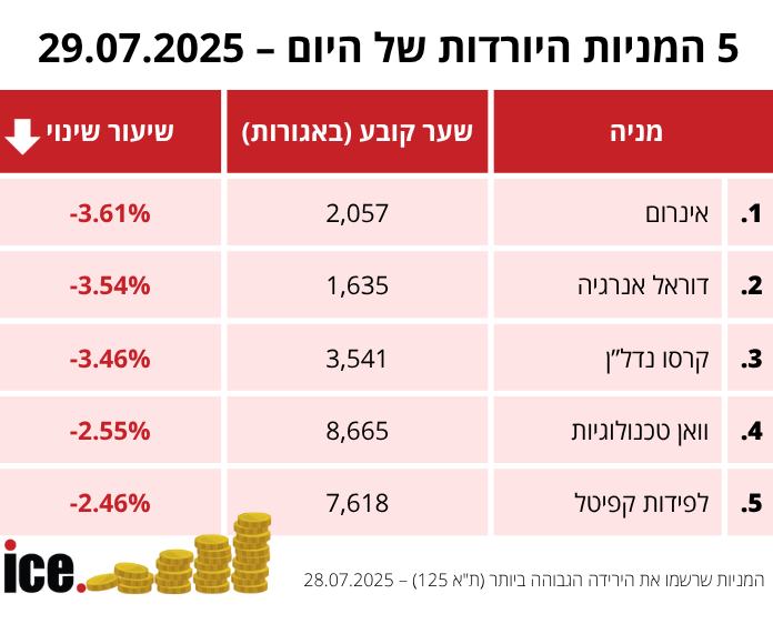 בקרב המניות עם הירידות הגדולות ביותר, אינרום, שדווקא צמחה מאז סיום המלחמה עם איראן, במקום הראשון עם ירידה של 3.61% ושער של 2,057. אחריה דוראל אנרגיה עם ירידה של 3.54% ושער של 1,635 אגורות. במקום השלישי קרסו נדל"ן עם ירידה של 3.46% ושער של 3,541 אגורות. אחריהן וואן טכנולוגיות (-2.55%) ולפידות קפיטל (-2.46%).