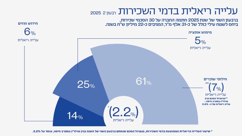 היו גם כמה אירועים בולטים השנה: החברה חתמה במהלך המחצית הראשונה של השנה על 85 הסכמי שכירות בנכסים קיימים בעלייה ריאלית ממוצעת בשיעור של כ-3.1%. בנטרול הסכם שנחתם ברבעון השני של השנה בגין מרלו"ג במפרץ חיפה, עומד שיעור העלייה הריאלית הממוצעת בחציון הראשון של השנה על 5.5%.