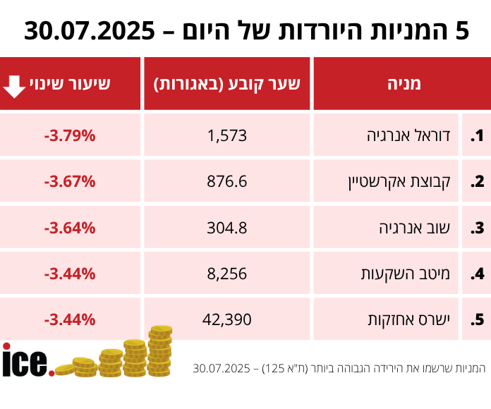 בקרב חמש המניות היורדות, המפסידה הגדולה היא המניה של דוראל אנרגיה שרושמת ירידה בשיעור של 3.79% לרמה של 1,573 אגורות. במקום השני נמצאת המניה של קבוצת אקרשטיין שיורדה ב-3.67% לרמה של 876.6 אגורות.
