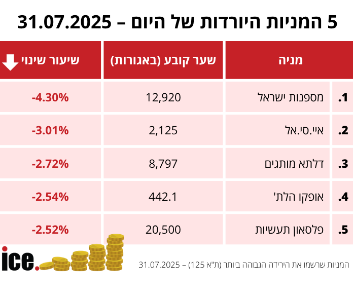 בקרב חמש המניות היורדות, המפסידה הגדולה היא המניה של מספנות ישראל שאיבדה מערכה 4.3% לרמה של 12,920 אגורות. במקום השני נמצאת המניה של איי.סי.אל שרשמה ירידה של 3.01% לרמה של 2,125 אגורות.