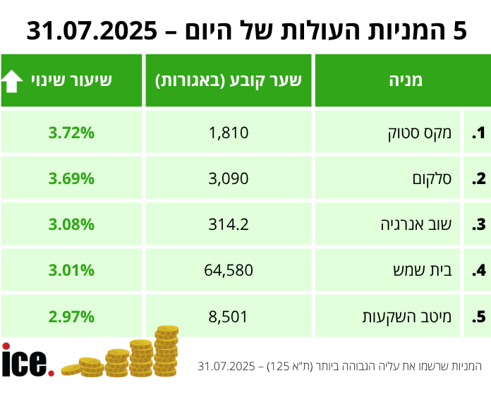 בקרב חמש המניות העולות, המנצחת הגדולה היא המניה של מקס סטוק שרשמה עלייה של 3.72% לרמה של 1,810 אגורות. במקום השני נמצאת המניה של סלקום שעלתה בשיעור של 3.69% לרמה של 3,090 אגורות.