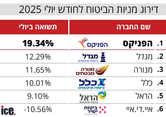 גם יולי היה חודש ירוק עבור מניות הביטוח, כשהמדד רשם עלייה של כ-11%. מי שהובילה בפער ניכר היא הפניקס שעלתה ב-19.34% לשווי של 29.22 מיליארד שקל, הגבוה מבין חברות הביטוח וכזה שהופך אותה לאחד מהגופים הפיננסיים הגדולים בישראל, כשהיא שווה יותר אפילו מהבנק החמישי בגודלו - הבינלאומי שנסחר לפי שווי של כ-23.76 מיליארד שקל. מתחילת השנה הפניקס עלתה ב-128.3%.