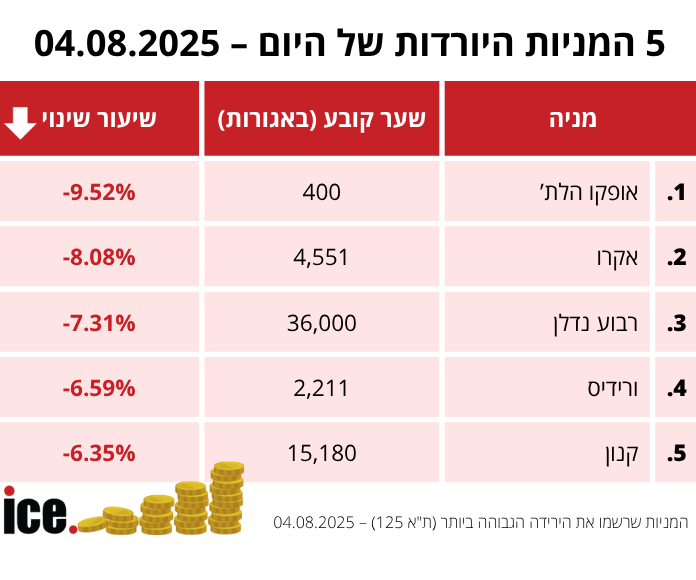 בקרב חמש המניות היורדות, המפסידה הגדולה היא אופקו הלת' שירדה ב-9.52% בסיום יום המחסר הנוכחי. הירידה הגדולה הובילה אותה למצב של 400 אגורות. מייד אחריה, אקרו שרשמה גם היא צניחה משמעותית של 8.08% והגיעה למצב של 4,5551 אגורות.