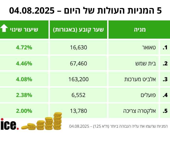 בקרב חמש המניות העולות של מדד ת"א 125, מניית טאואר עלתה בשיעור של 4.72% והגיעה לרמה של 16,630 אגורות. מייד אחריה במקום השני, מי שנושפת בעורפה היא מניית בית שמש שזינקה ב-4.46% והגיעה לרמה של 67,460 אגורות.