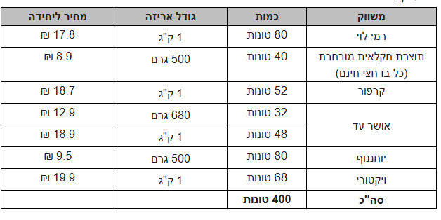 החלוקה נעשתה בהתאם למחירים לצרכן שהוצעו ולכמות המבוקשת על ידי הזוכים ובהיקף כולל של 400 טונות דבש. הדבש ישווק במגוון גדלים בין חצי ק"ג ל-1 ק"ג ובמחיר שנע בין 8.9 שקל ועד 19.9 שקל, לפי הפירוט הבא: רמי לוי ימכור 80 טון של 1 ק"ג ב-17.8 שקל והוא ימכור את הכמות הגבוהה ביותר לצד אושר עד ויחננוף שימכרו את הדבש ב-18.9 שקל לק''ג וב-9.5 שקל לחצי ק''ג בהתאמה.