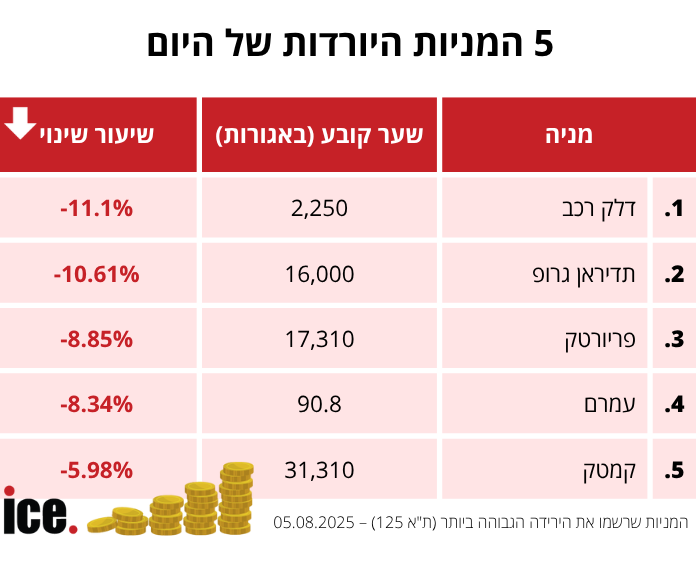 בקרב המניות עם הירידות הגדולות ביותר, דלק רכב, שטלטלה את השוק עם רכישת ענק, במקום הראשון עם ירידה של 11.1% ושער של 2,250. אחריה תדיראן גרופ עם ירידה של 10.61% ושער של 16,000 אגורות. במקום השלישי פריורטק עם ירידה של 8.85% ושער של 3,563 אגורות. אחריהן עמרם (-8.34%) וקמטק (-5.98%).