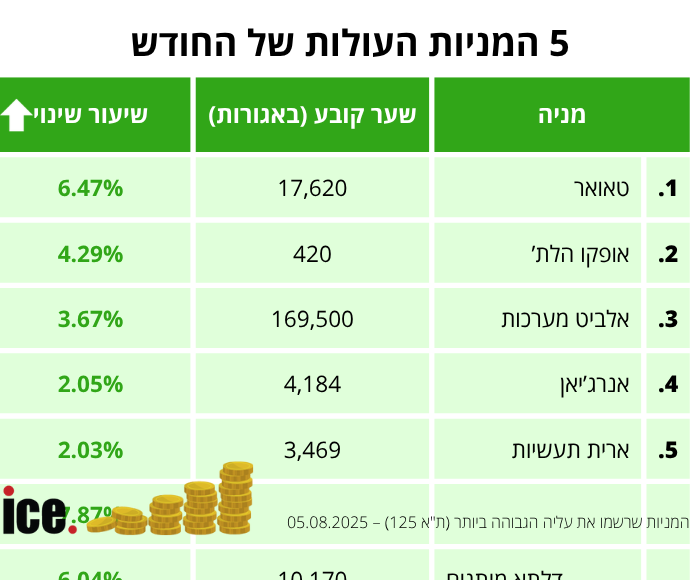 בקרב חמש המניות העולות, מניית טאואר תופסת את המקום הראשון עם עליה של 6.47% לרמה של 17,620 אגורות. מניית אופקו הלת' במקום השני עם עליה של 4.29% לרמה של 420 אגורות.