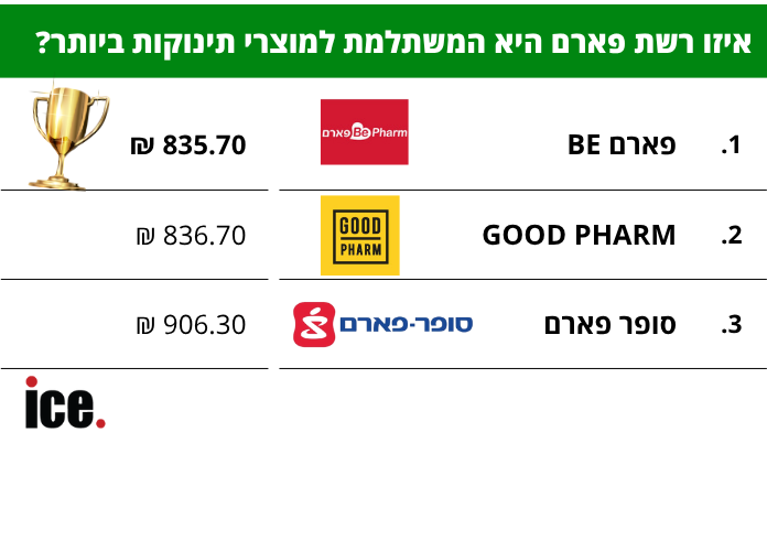 בדקנו והשווינו היכן משתלם יותר לרכוש סל קניות לתינוקות, בין שלוש מרשתות הפארם הגדולות בישראל: BE פארם, GOOD PHARM ו־סופר־פארם. בין המוצרים שנבדקו נכללו חיתולים, תחליפי חלב (תמ"ל), מגבונים לחים, מחיות גרבר ועוד.