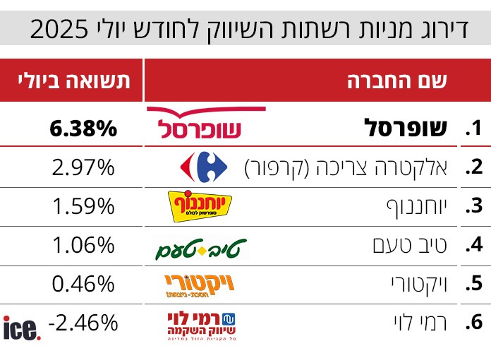 מי שהובילה בתשואה בחודש יולי היא מניית שופרסל, החברה הגדולה ביותר מבין הרשתות לפי שווי שוק כשהיא נסחרת לפי שווי של כ-10.66 מיליארד שקל. מניית שופרסל קפצה ב-6.38% ביולי ומתחילת השנה היא עלתה ב-9.5%.