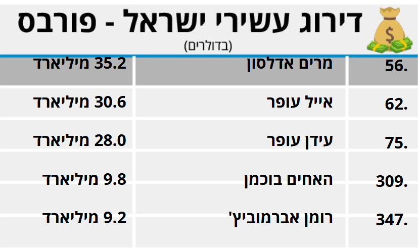 דירוג עשירי ישראל על פי מגזין "פורבס" פורסם כמדי שבוע והביא עמו את הצמרת הגבוהה ביותר גם כאן, בישראל. מי ששומרת על הפסגה בגאון היא מרים אדלסון, שהכניסה השבוע 112 מיליון דולר (כ-386 מיליון שקל), כאשר היא ממוקמת במקום ה-56 בעולם עם הון אישי שמוערך ב-35.2 מיליארד דולר.