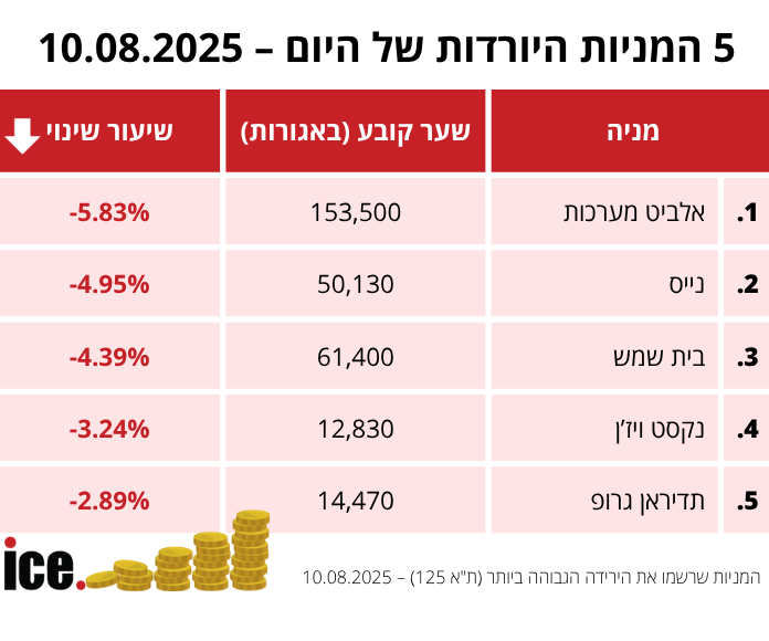 בגזרת המניות היורדות של יום המסחר הראשון השבוע היא אלביט מערכות שצונחת ב-5.83%, לרמה של 153,500 אגורות. במקום השני שייך לחברת נייס שירדה ב-4.95% לרמה של 50,130 אגורות.