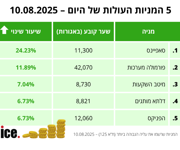 במקום השלישי, נמצאת מיטב השקעות שעלתה ב-7.04% לרמה של 8,730 אגורות. המניות, דלתא מותגים והפניקס מזנקות ב-6.73%, דלתא מותגים לרמה של 8,821 אגורות והפניקס לרמה של 12,060 אגורות.