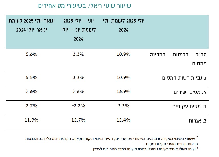 בשיעורי מס אחידים, עלו הכנסות המדינה ממסים בחודש יולי במונחים ריאליים ב-11% לעומת יולי 2024. גם הגביה ממסים ישירים עלתה - ב-17% לעומת אשתקד. הגביה ממסים עקיפים עלתה ב-3% והגביה מאגרות עלתה ב-12%.
