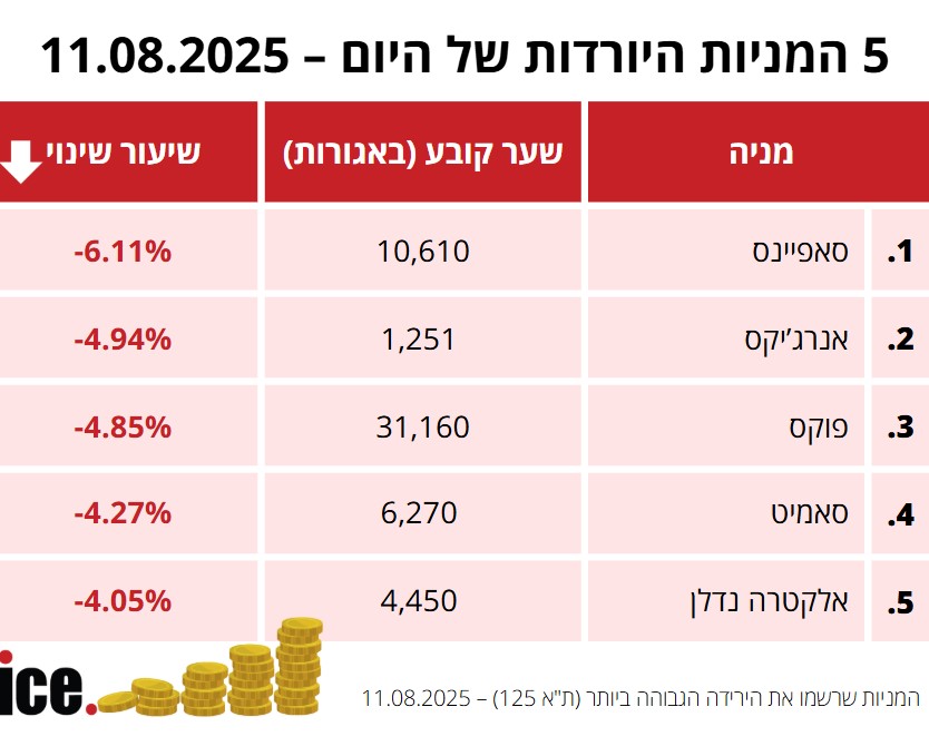 בקרב חמש המניות היורדות, המפסידה היא חברת סאפיינס אשר צנחה ב-6.11% לרמה של 10,610 אגורות. מנייתה של חברת אנרג'יקס שירדה ב-4.94% לרמה של 1,251 אגורות. חברה נוספת שהציגה הפסד מהותי בגזרת המניות היא פוקס, הנשלטת על ידי איש העסקים הראל ויזל. מנייתה של חברת פוקס פחתה ב-4.85% לרמה של 31,160 אגורות. אחריה, ניצבת חברת סאמיט שמנייתה ירדה ב-4.27% לרמה של 6,270 אגורות.
