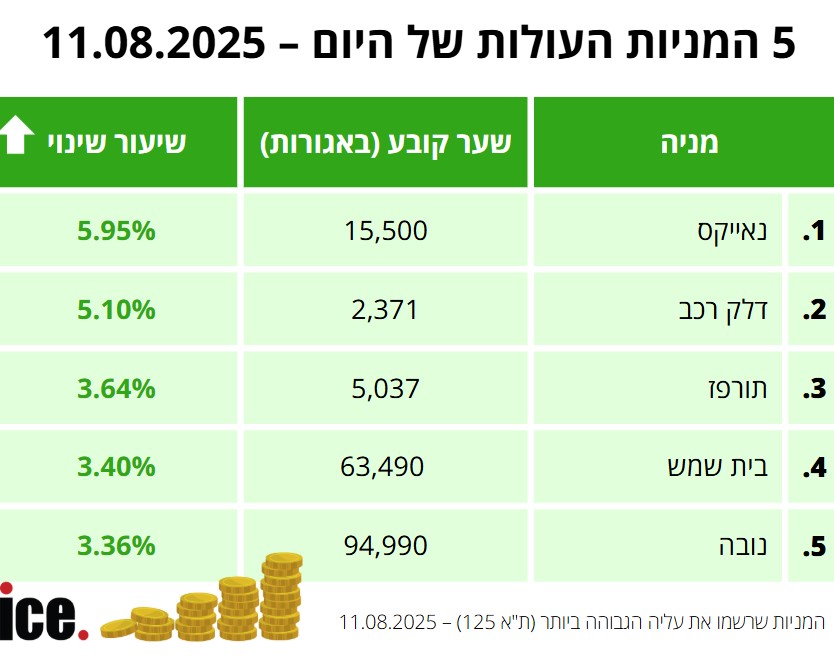 בקרב חמש המניות העולות, המנצחת היא חברת נאייקס שמנייתה צמחה ב-5.95% לרמה של 15,500 אגורות. במקום השני, ניצבת חברת דלק רכב שמנייתה עלתה ב-5.10% לרמה של 2,371 אגורות.
