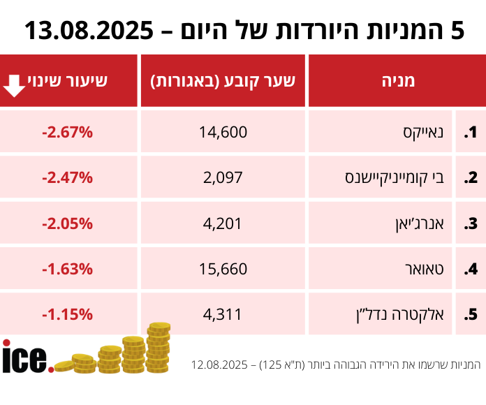 בקרב המניות עם הירידות הגדולות ביותר, נאייקס במקום הראשון עם ירידה של 2.67% ושער של 14,600. אחריה בי קומיוניקיישנס עם ירידה של 2.47% ושער של 2,097 אגורות. במקום השלישי אנרג'יאן עם ירידה של 2.05% ושער של 4,201 אגורות. אחריהן טאואר (-1.63%) ואלקטרה נדל"ן (-1.15%).