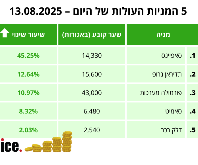 בקרב חמש המניות העולות, מניית סאפיינס תופסת את המקום הראשון עם זינוק של 45.25% לרמה של 14,330 אגורות בעקבות עסקת הענק בשווי 2.5 מיליארד דולר. מניית תדיראן גרופ במקום השני עם עליה של 12.64% לרמה של 15,600 אגורות.