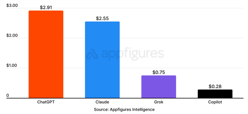 אחד הנתונים המרשימים ביותר בדו"ח הוא ההכנסה הממוצעת פר התקנה: 2.91 דולר לכל משתמש שהוריד את האפליקציה. לצורך ההשוואה, Copilot מניבה רק 0.28 דולר פר התקנה, Grok מסתפקת ב-0.75 דולר, ו-Claude קצת יותר עם 2.55 דולר. כלומר, צ'אט ג'יפיטי לא רק מושכת יותר משתמשים, היא גם יודעת להמיר אותם להכנסות טוב יותר מכל אחת מהמתחרות שלה.