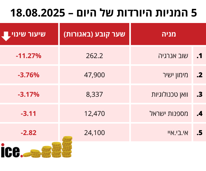 בקרב המניות עם הירידות הגדולות ביותר, שוב אנרגיה צונחת ביותר מ-11%, המנייה צונחת ב-11.27% לרמה של 262.2 אגורות. מנייתה של מימון ישיר יורדת ב-3.76% לרמה של 262.2 אגורות.