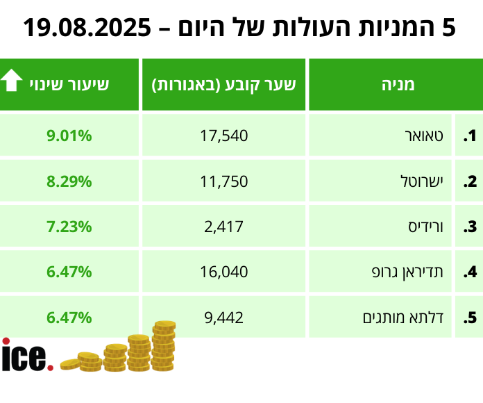 בקרב חמש המניות העולות, מי שתופסת את המקום הראשון בסיום יום המסחר היא טאואר שעלתה ב-9.01% לרמה של 17,540. מייד אחריה, נמצאת המנייה שסיימה את יום המסחר הקודם במקום הרביעי, ישרוטל. המנייה עלתה בשיעור של 8.29% לרמה של 11,750 אגורות.