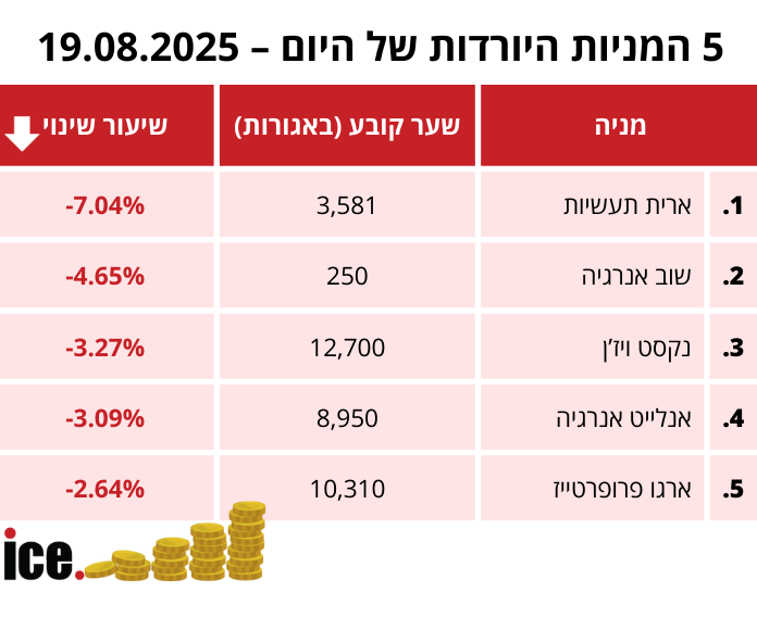 במקום הרביעי נמצאת אנלייט אנרגיה עם ירידה של 3.09% לרמה של 8,950 אגורות, מי שסוגרת את הרשימה היא ארגו פרופרטייז שירדה ב-2.64% לרמה של 10,310 אגורות.