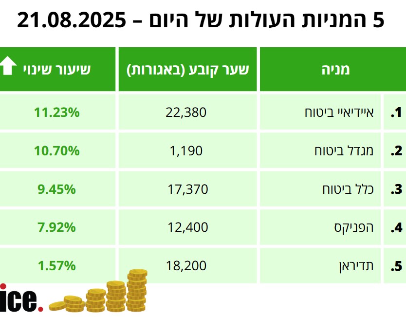 בקרב חמש המניות העולות, החברה שהציגה הישג בולט בגזרת המניות היא איידיאיי ביטוח. מניית החברה זינקה ב-11.23% לרמה של 22,380 אגורות. במקום השני, ניצבת חברת מגדל שמנייתה עלתה ב-10.70% לרמה של 1,190 אגורות.