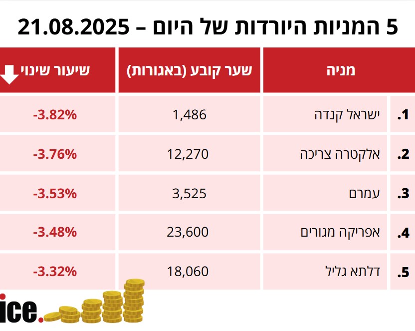 בקרב חמש המניות היורדות, ישראל קנדה רשמה את השינוי השלילי הבולט ביותר עם ירידה של 3.82% לרמה של 1,486 אגורות. אלקטרה צריכה פחתה ב-3.76% לרמה של 12,270 אגורות.