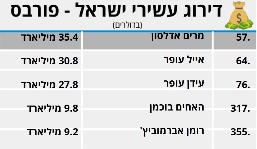 דירוג עשירי העולם של מגזין "פורבס" פורסם, ואיתו כמובן גם צמרת האנשים העשירים ביותר בישראל, עבורם היה זה שבוע לא פשוט בכלל. למרות ששוב רשמה הפסדים, הפעם של 43 מיליון דולר, מרים אדלסון שומרת על הפסגה עם הון אישי שמוערך ב-35.4 מיליארד דולר, כשהיא במקום ה-57 בעולם.