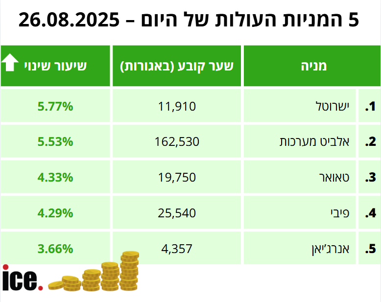 ברשימת העולות הבולטות: ישרוטל נוסקת 5.77% לשער 11,910 אגורות, אלביט מערכות קופצת ב-5.53% לשער 162,530 אגורות, טאואר מטפסת 4.33% לשער 19,750 אגורות, פיבי עולה ב-4.29% לשער 25,540 אגורות ואנרג'יאן עולה ב-3.66% לשער 4,357 אגורות.