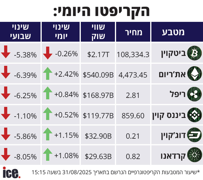 הביטקוין ממשיך את הצניחה מהשבוע האחרון, המטבע המוביל רושם ירידה בערכו בשיעור של 0.26%, כעת הוא עומד על 2.17 טריליון דולר ונסחר לפי מחיר של 108,334.3 דולר.