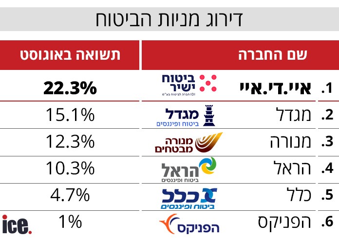 מבין החברות הגדולות, איי.די.איי הציגה את התשואה המרשימה ביותר באוגוסט - 22.3%. ביטוח ישיר רשמה רבעון שיא עם הכנסות של 101 מיליון שקל, קרוב לפי 2 לעומת הרבעון המקביל בו הסתכמו ההכנסות ב-53 מיליון שקל.