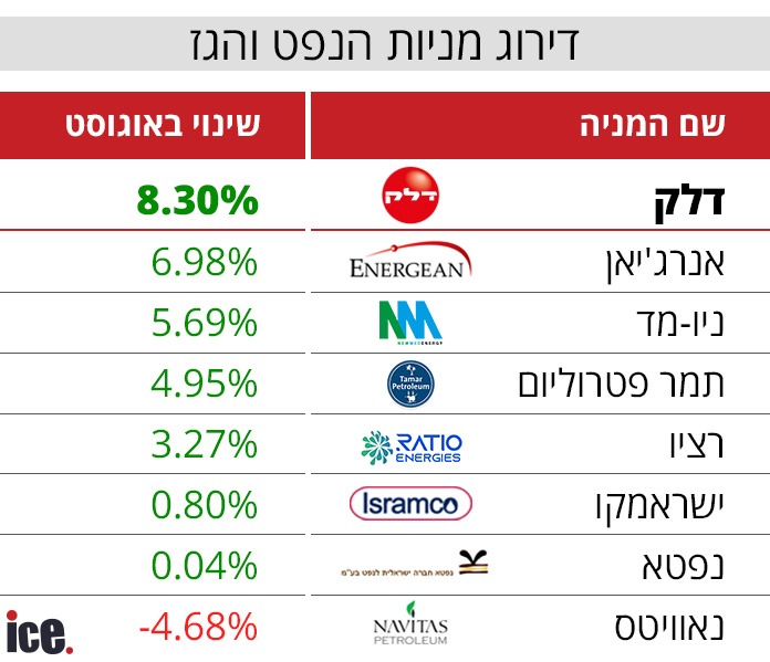 מניות הנפט והגז רשמו חודש חיובי בחודש אוגוסט, כשהמדד עצמו קפץ בכ-3.3%. העליות הגיעו על רקע פרסום הדוחות הכספיים של החברות, שחלקם היו מושפעים ממלחמת עם כלביא שפגעה בפעילות למשך כ-12 ימים בסוף הרבעון השני.