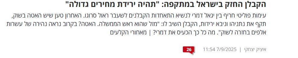 "ככל שהמצב הזה יימשך, במצב הרע ירידה חד ספרתית שנתית, שהיא תתהפך בטווח הבינוני והארוך. כשבונים פחות קשה מאוד להזיז את הספינה בבת אחת. אנחנו צפויים לירידות קלות בלבד. בסיום המלחמה, עם ירידת הריבית, מחירי הנדל"ן יעלו".