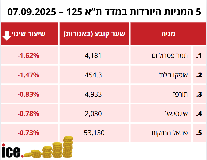 בקרב חמש המניות היורדות, המפסידה היא חברת תמר פטרוליום שירדה ב-1.62% לרמה של 4,181 אגורות. חברת אופקו הלת' ניצבת במקום השני עם ירידה של 1.47% לרמה של 454.3 אגורות.