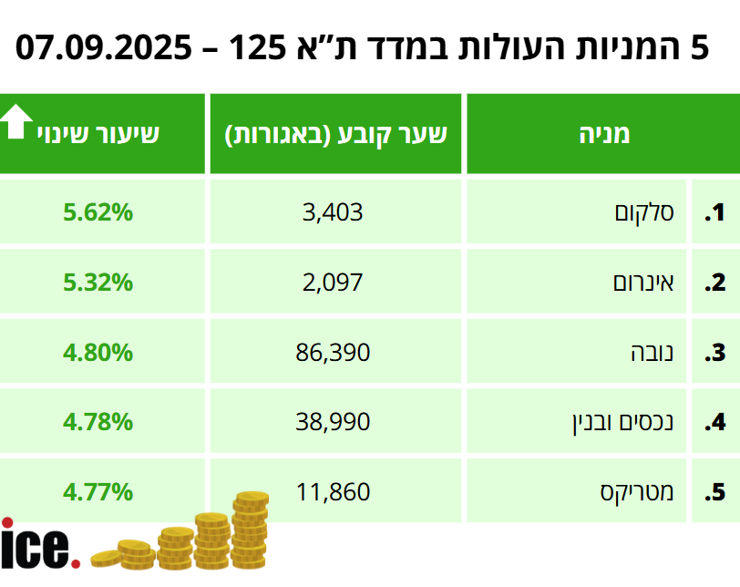 בקרב חמש המניות העולות, חברת התקשורת סלקום עלתה -5.62% לרמה של 3,403 אגורות. במקום השני, ניצבת חברת אינרום שמנייתה צמחה ב-5.32% לרמה של 2,097 אגורות.