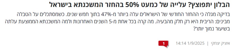 "הצורך בהלוואות לכל מטרה (גם החודש 571 מיליון שקלים) בעיקר לאיחוד הלוואות והפחתת תשלומים חודשיים נמשך גם כעת, שנתיים לאחר פרוץ המלחמה. משקי בית רבים חוו עלייה חדה בהחזרים החודשיים על הלוואות קמעונאיות והם נאלצים למחזר את חובותיהם באמצעות שעבוד הנכס ופריסת ההחזרים לתקופות ארוכות יותר".