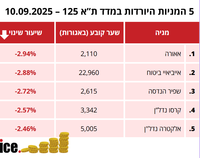 בקרב חמש המניות היורדות, המפסידה היא חברת אאורה שמנייתה פחתה ב-2.94% לרמה של 2,110 אגורות. אחריה, חברת הביטוח איידיאיי פחתה ב-2.88% לרמה של 22,960 אגורות.