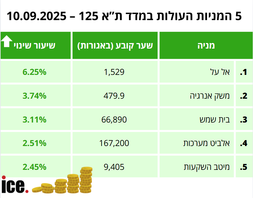 בקרב חמש המניות העולות, המנצחת היא חברת התעופה אל על שמנייתה עלתה ב-6.25% לרמה של 1,529 אגורות. מנייתה של משק אנרגיה גדלה ב-3.74% לרמה של 479.9 אגורות.