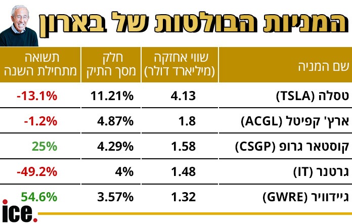 המניות הבולטות הנוספות בתיק של בארון הןחברת הביטוח וביטוח המשנה ארץ' קפיטל, קוסטאר שמספקת שירותי אנליטיקה לעסקים, חברת המחקר המתמקדת בטכנולוגיה וסייבר - גרטנר ופלטפורמת הביטוח גיידוויר.
