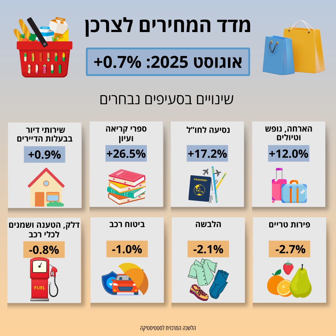 על פי נתוני הלשכה המרכזית לסטטיסטיקה מדד המחירים לצרכן עלה ב-0.7% בחודש אוגוסט 2025, בהשוואה לחודש יולי 2025 . בשנים עשר החודשים האחרונים (אוגוסט 2025 לעומת אוגוסט 2024), מדד המחירים לצרכן עלה ב-2.9%.
