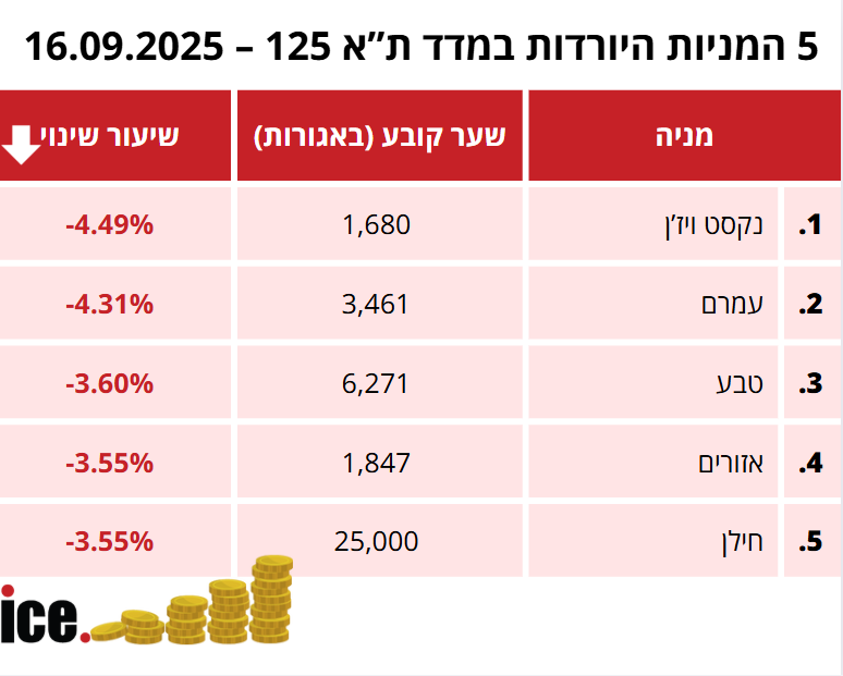 בקרב חמש המניות היורדות, המפסידה היא חברת נקסט ויז'ן שמנייתה ירדה ב-4.49% לרמה של 1,680 אגורות. מנייתה עמרם צנחה ב-4.31% לרמה של 3,461 אגורות. במקום השלישי, ניצבת טבע שמנייתה ירדה ב-3.60% לרמה של 6,271 אגורות.