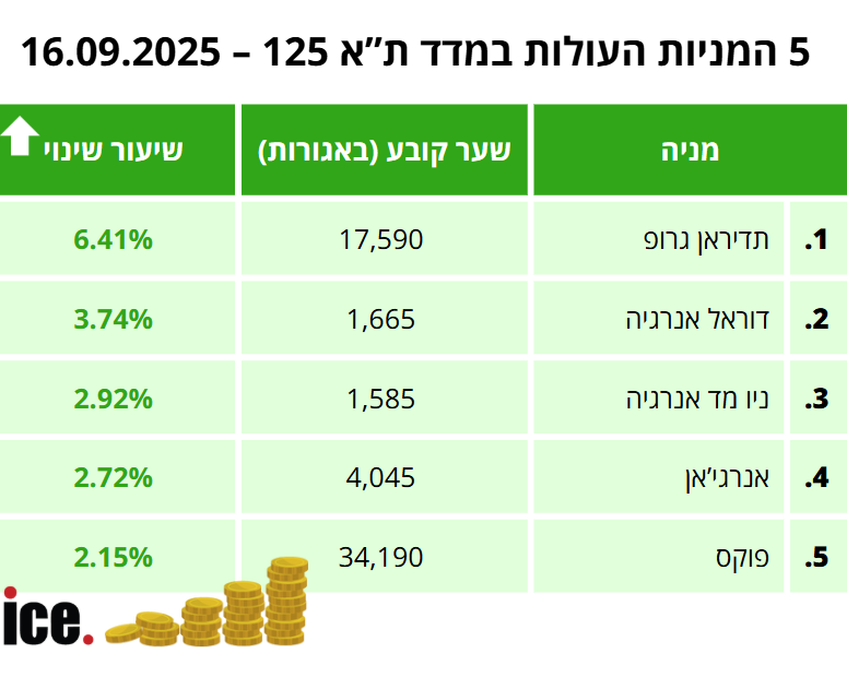 בקרב חמש המניות העולות, המנצחת היא תדיראן שמנייתה עלתה ב-6.41% לרמה של 17,590 אגורות. חברה נוספת שהציגה שינוי חיובי בגזרת המניות היא דוראל אנרגיה. מנייתה צמחה ב-3.74% לרמה של 1,665 אגורות.