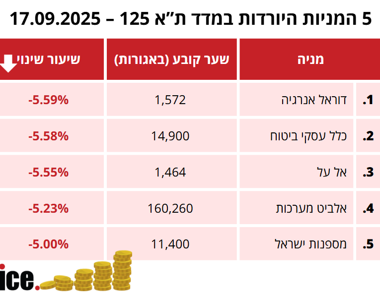 בקרב חמש המניות היורדות, המפסידה היא חברת דוראל אנרגיה שמנייתה ירדה ב-5.59% לרמה של 1,572 אגורות. מניית כלל ביטוח צללה ב-5.58% לרמה של 14,900 אגורות.