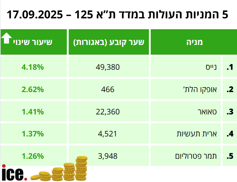 בקרב חמש המניות העולות, המנצחת היא חברת נייס שמנייתה עלתה ב-4.18% לרמה של 49,380 אגורות. חברה נוספת שהציגה שינוי חיובי במניות היא אופקו הלת'. מנייתה גדלה ב-2.62% לרמה של 466 אגורות.