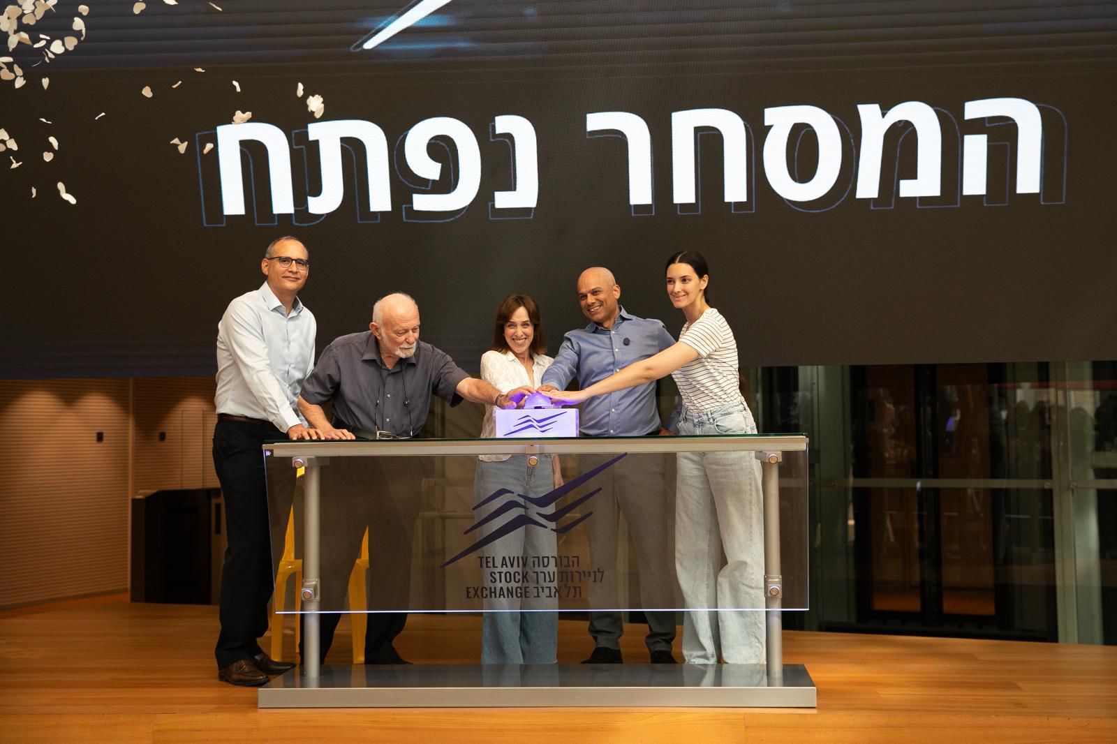 שחר ליניק לקוחת הבנק בת 20 שבחרה במניות, ידין ענתבי מנכ"ל בנק הפועלים, ליאת הר-לב הפרזנטורית של הבנק, דן הדני לקוח הבנק בן ה-101 שבחר במניות, איתי בן-זאב מנכ"ל הבורסה לניירות ערך. צילום: יחצ