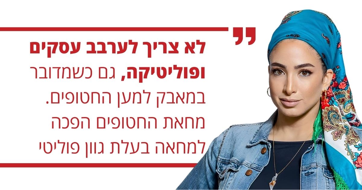 "כי אני לא חושבת שצריך לערבב עסקים עם פוליטיקה. בסופו של יום, אתה משרת מגוון רחב של אוכלוסייה. זה לא משנה אם אלה ערבים, יהודים, שמאלנים, ימנים, דתיים או חילונים. אתה גם משרת אנשים שיכולת הקנייה שלהם מאוד נקודתית כרגע. אם זה אוכל לילדים או לתינוקות, אתה לא יכול לערבב את זה עם מחאות. אין בעיה שאני אלך ברחובות ואביע עמדה. אין קשר בין השניים. עסק צריך לשרת את הלקוחות שלו. גם אי אפשר להתעלם מזה שמחאת החטופים הפכה ברגע מסוים לסוג גם של מחאה פוליטית. מצד אחד דרשו להחזיר אותם עכשיו, ואני לגמרי שם, אבל מצד שני, זה גם הפך למאבק מול השלטון הנוכחי, מול נתניהו, וזה מקום שאני לא רוצה להיות בו כעסק, כצעד פוליטי ולא משנה מי בראש הממשלה. ברוך השם, אנחנו תורמים, גם למען משפחות החטופים, וזה קורה מהצד, אבל ברגע שזה נכנס לרובד פוליטי, אנחנו לא מערבבים את זה עם הפעילות העסקית שלנו".