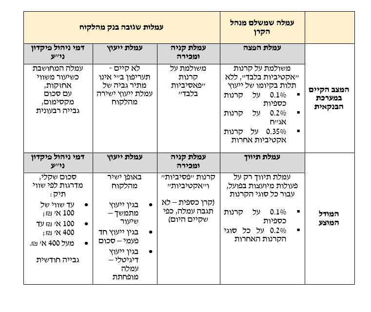 להלן עיקרי המתווה המוצע, אשר מטפל בעמלות המשולמות במישרין מהמשקיעים ובעמלות הנגבות בין השחקנים: