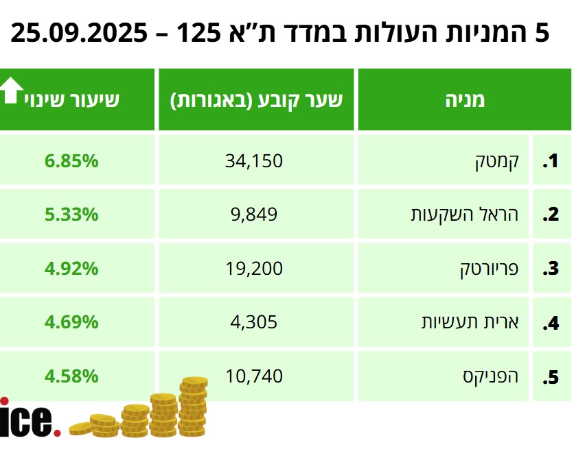 בקרב חמש המניות העולות, המנצחת היא קמטק שמנייתה עלתה ב-6.85% לרמה של 34,150 אגורות. חברת הביטוח הראל הציגה שינוי חיובי במניות. מנייתה צמחה ב-5.33% לרמה של 9,849 אגורות.