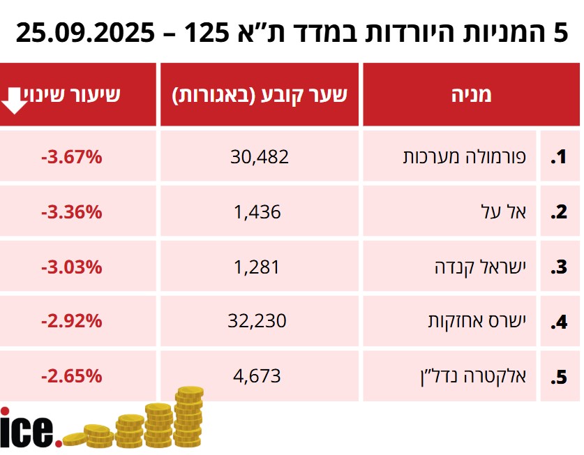 בקרב חמש המניות היורדות, המפסידה היא חברת פורמולה מערכות שמנייתה ירדה ב-3.67% לרמה של 43,350 אגורות. חברת התעופה אל על פחתה ב-3.36% לרמה של 1,436 אגורות.